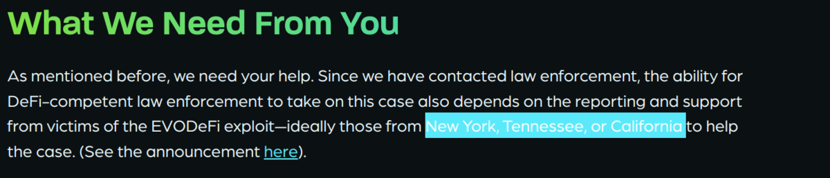 RugDocを読んでいると、ニューヨークとかの居住者は裁判とか起こせるから助けて!みたいな記述がありました。これはEVODEFIがRugった当時のRugDoc Teleglamで言及があったものと同じです。